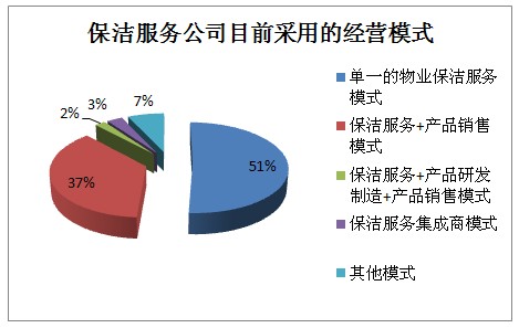 現(xiàn)階段,大部分的物業(yè)保潔公司還是采用專業(yè)化單一的保潔服務(wù)發(fā)展模式,在這物業(yè)保潔的市場(chǎng)里不斷發(fā)展壯大,逐漸形成了保潔服務(wù)高度專業(yè)化的競爭優(yōu)勢(shì)。調(diào)查結(jié)果顯示:單一的物業(yè)保潔服務(wù)模仍被采用的企業(yè)占51%,保潔服務(wù)+產(chǎn)品銷售的發(fā)展模式占37%,是目前物業(yè)保潔服務(wù)公司的兩大經(jīng)營模式。