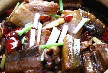 砂鍋鱔魚(yú)的做法:先將冬菇浸軟去腳、燒腩切塊,蒜肉用將滾之油炸黃撈起,把鱔魚(yú)洗凈抹水?dāng)貕K,加 腌料腌二十分鐘。然后將鱔魚(yú)沾滿生粉用滾油大火炸黃撈起,約二分鐘后重炸至金黃色撈起。再將生菜洗凈,切短段放在煲仔內(nèi) 。[美食中國(guó)]在鍋內(nèi)放油一湯匙,爆香姜、蒜,放冬菇和酒半湯匙,加入調(diào)味煮滾,把燒肉和鱔魚(yú)兜均勻,倒落在己放有生菜之 煲內(nèi),最后加蓋大火煮滾,放蔥和加油二湯匙即可。