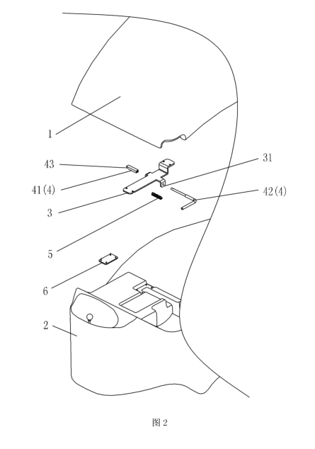組裝時(shí),將鎖扣拉桿42、鎖扣銷41分別穿過固定板3兩端的支耳31,將彈簧5套裝在鎖扣拉桿42上,然后將鎖扣拉桿42與鎖扣銷41固定連接。